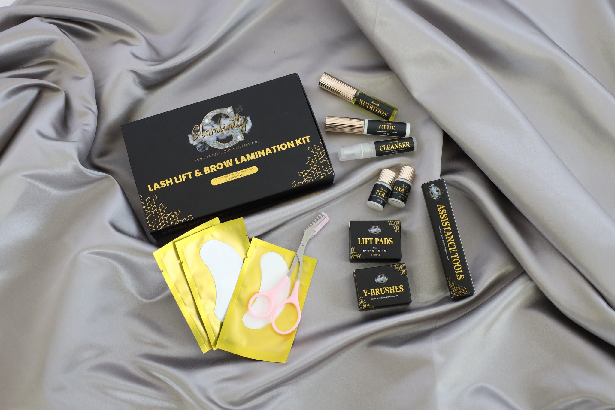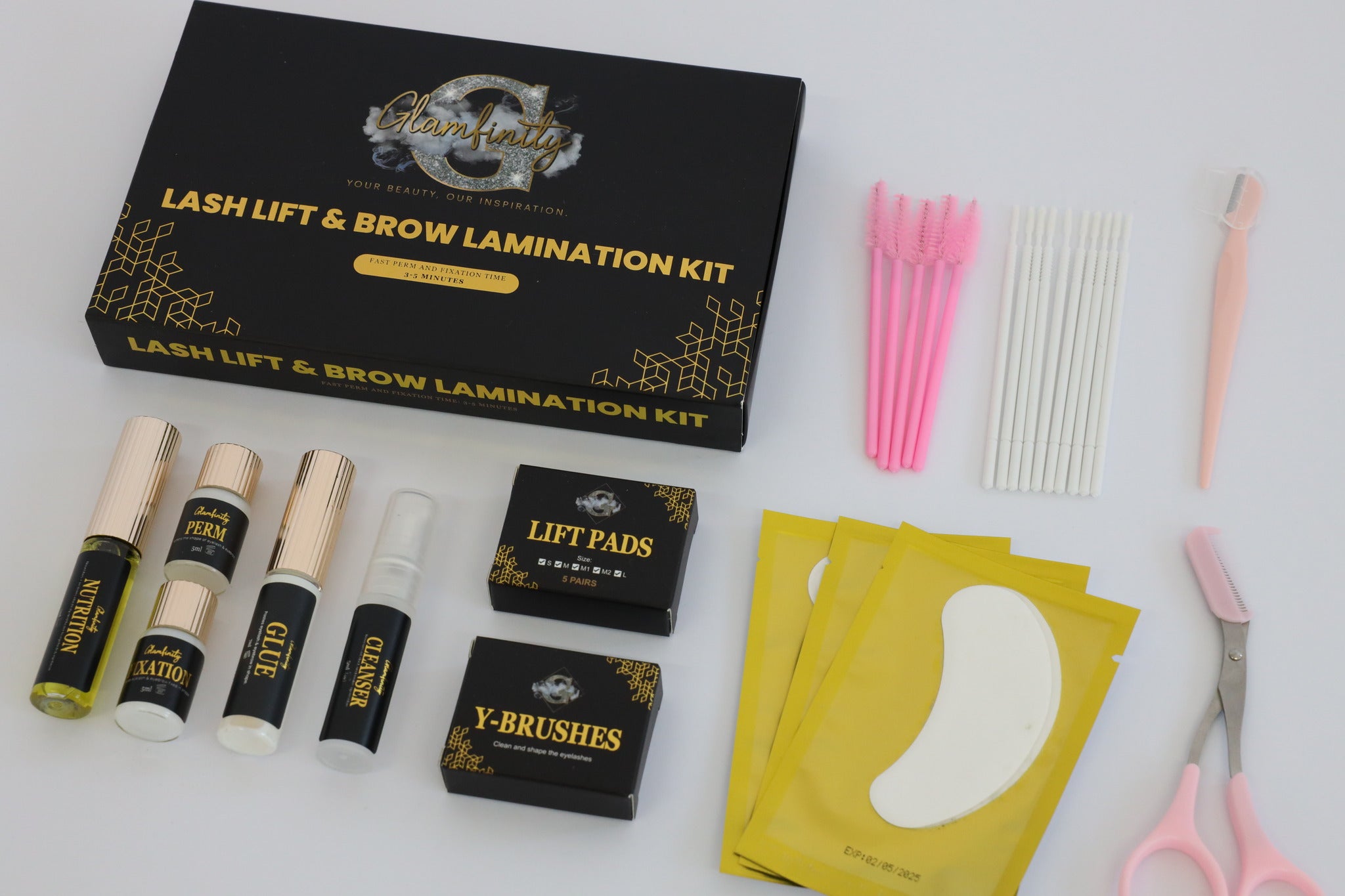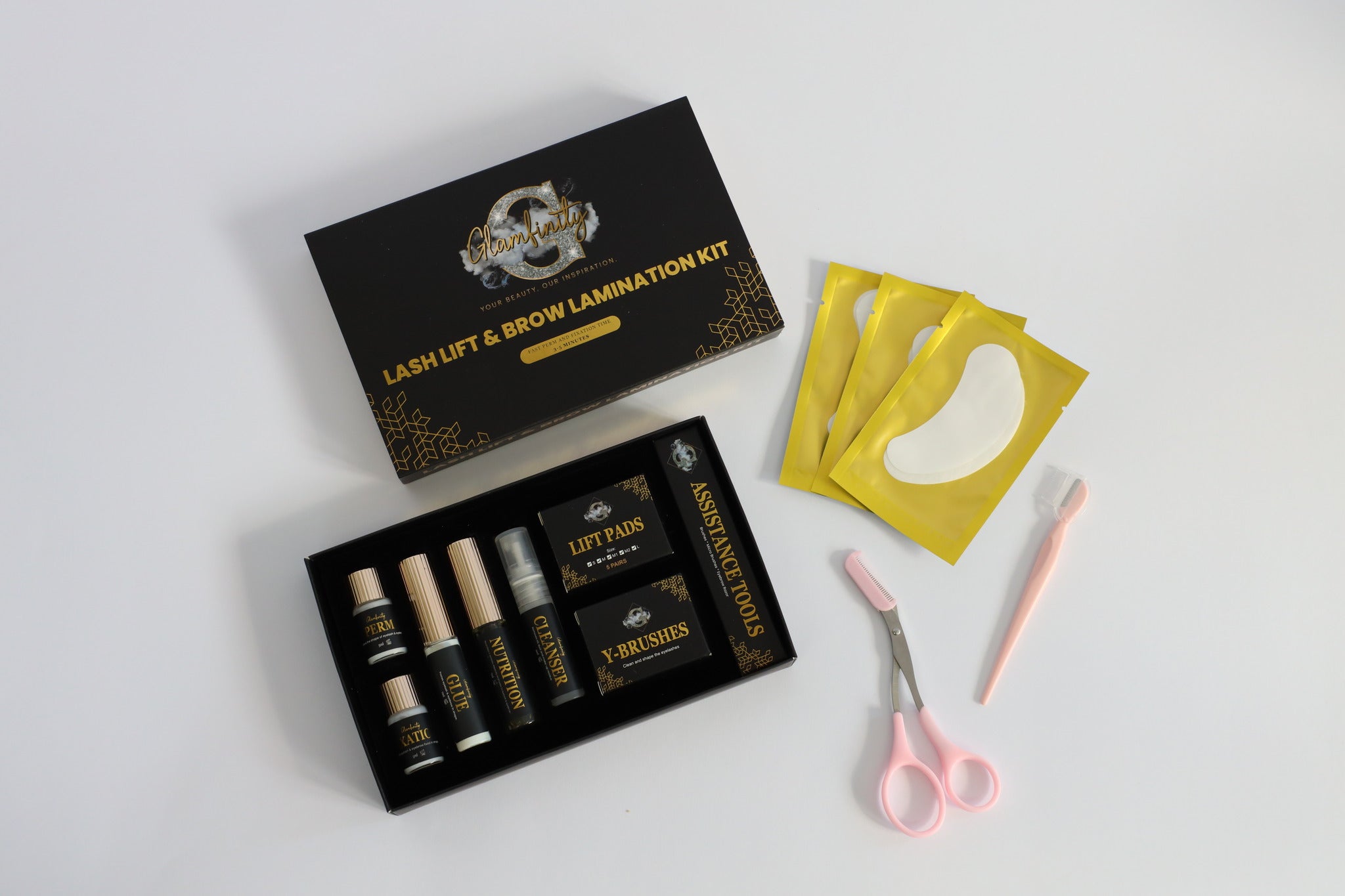 De Glamfinity Kit is niet zomaar een lash lift of brow lamination kit; het is een complete verzorgingsset. Van het liften tot het voeden en versterken van je haren, alles wat je nodig hebt voor een indrukwekkende oogopslag zit in één luxueuze verpakking.